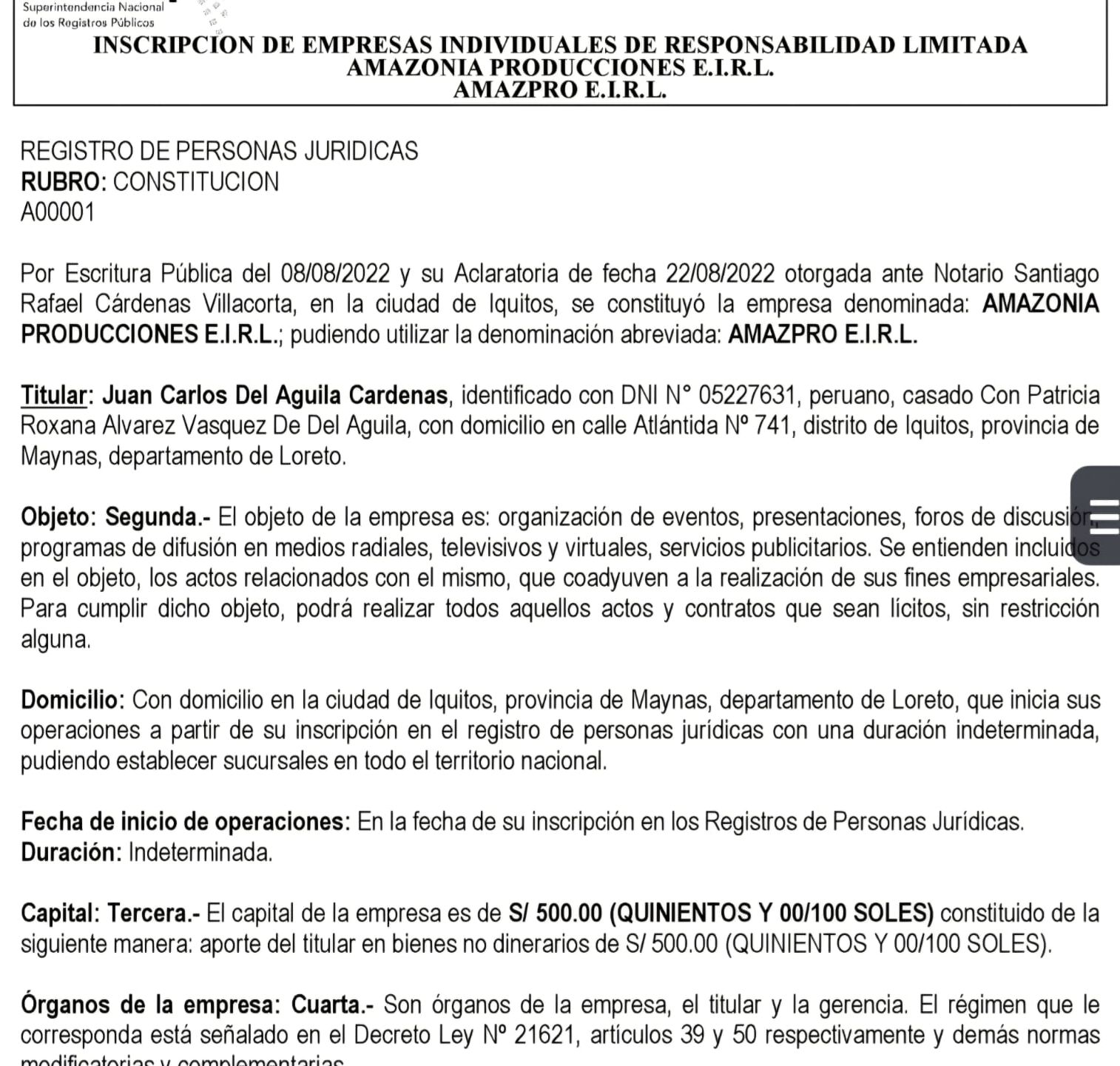 - Amazonia Producciones EIRL, con un capital declarado de S/ 10,000.00