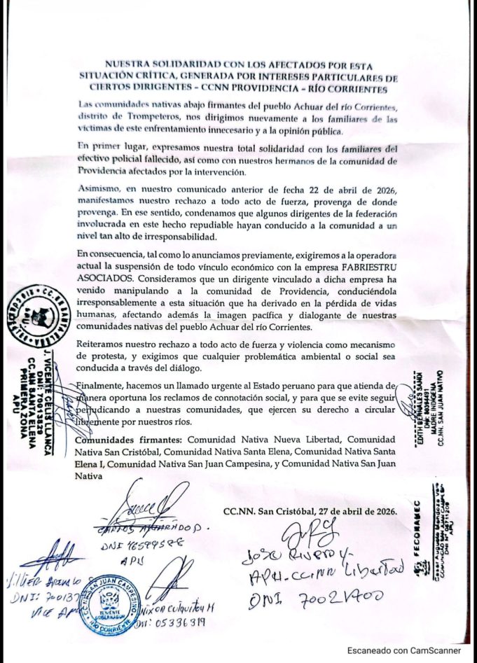 Las comunidades nativas firmantes del pueblo Achuar del río Corrientes, en el distrito de Trompeteros, expresaron su solidaridad con los familiares del efectivo policial fallecido y con los pobladores de Providencia afectados por el reciente enfrentamiento. En un pronunciamiento fechado el 27 de abril, rechazaron el uso de la violencia y señalaron que la situación habría sido agravada por decisiones de algunos dirigentes, a quienes atribuyen haber conducido a la comunidad a un escenario de alta tensión.
