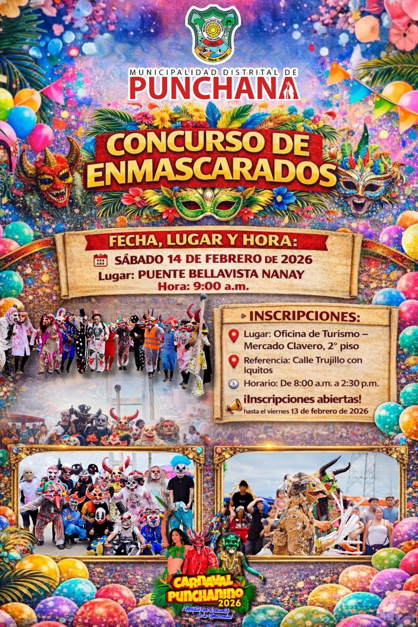 La Municipalidad Distrital de Punchana invita a vivir la fiesta del carnaval este sábado 14 de febrero, desde las 9:00 a.m., en el Puente Bellavista Nanay.