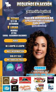 El productor Arturo Gómez anunció la llegada de Connie Chaparro a Iquitos para dictar el taller Pequeños en Acción, dirigido a niños de 6 a 13 años. La actividad se realizará el 27 y 28 de este mes y busca acercar a los menores al trabajo actoral mediante dinámicas y ejercicios lúdicos. El curso incluye escenas de guiones conocidos de producciones nacionales y servirá también como precasting para un cortometraje que Butacas Teatro grabará en diciembre.