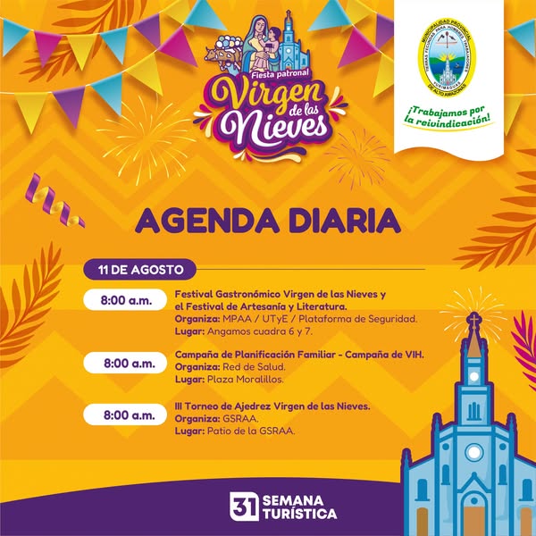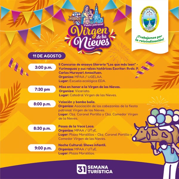 Inicio Institucionales Conoce las actividades que realizaremos hoy, , por la... Institucionales Conoce las actividades que realizaremos hoy, , por la » » ́ . Por ProyContra - 11/08/2025 210 0 FacebookTwitterPinterestWhatsApp Del 05 al 15 de agosto. #YuriPatroneando #FiestaPatronalVirgenDeLasNieves #TrabajamosPorLaReivindicación Artículos relacionadosMás del autor IMPACTO EN LA ACUICULTURA AMAZÓNICA: PISCICULTORES DEL RÍO MARAÑÓN RECIBEN ALEVINOS FORTALECIENDO LAZOS: PROYECTO ACUÍCOLA DIALOGA CON BENEFICIARIOS DE LA CARRETERA 5 DE ENERO ALCALDE OLMEX ESCALANTE CHOTA RINDE CUENTAS ANTE LA POBLACIÓN DE PUNCHANA EN AUDIENCIA PÚBLICA 2025