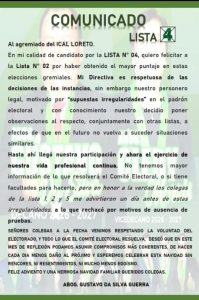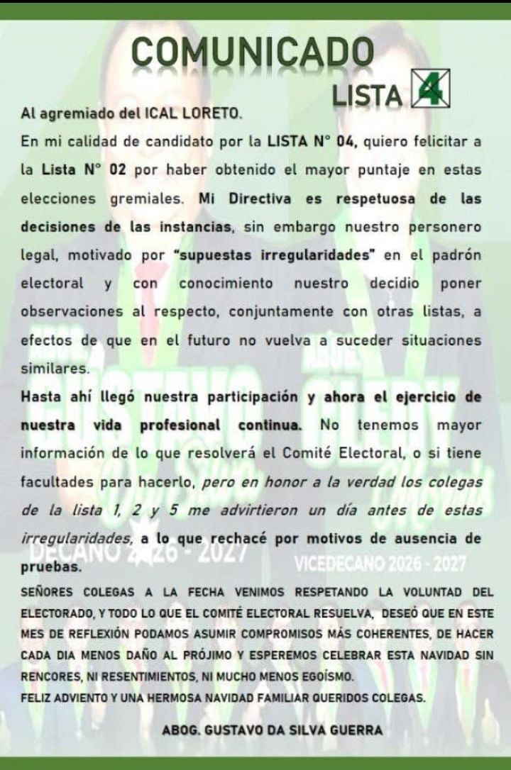 El abogado Gustavo Da Silva Guerra, ex candidato a la decanatura del Colegio de Abogados de Loreto (CAL) por la Lista N.º 4, afirmó que durante la víspera de las elecciones fue advertido sobre presuntas irregularidades en el padrón electoral. Indicó que, pese a las sospechas, en ese momento no existían pruebas que justificaran solicitar la anulación del proceso, por lo que decidió continuar. Da Silva sostuvo que confía en la actuación del comité electoral, aunque precisó que cualquier eventual irregularidad deberá contrastarse con la información remitida desde el despacho del decano encargado de proveer los padrones.