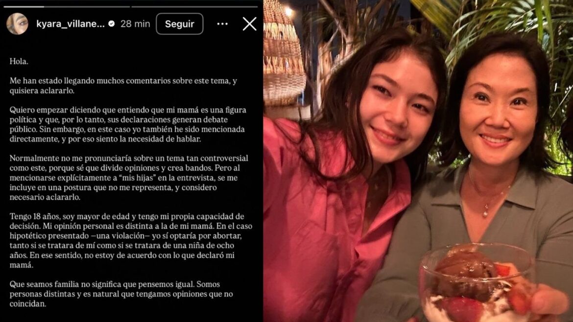 Kyara Villanella, hija de Keiko Fujimori, se pronunció en sus redes sociales para aclarar que no comparte la posición de su madre sobre el aborto. La joven de 18 años explicó que decidió intervenir luego de que, en una entrevista, se mencionara de manera explícita a “mis hijas”, lo que, según señaló, la incluyó en una postura que no la representa.