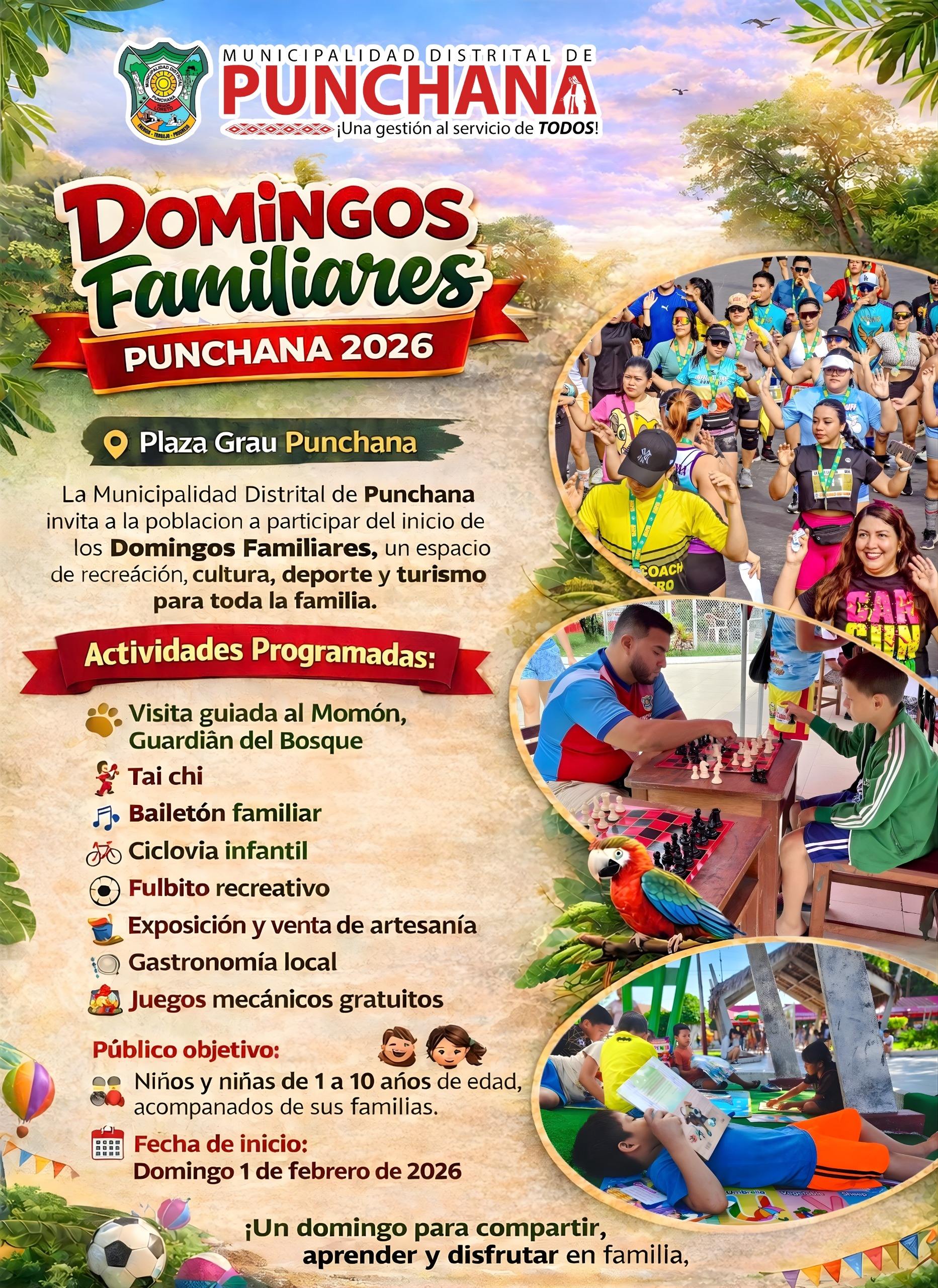 La iniciativa promueve la integración familiar mediante actividades recreativas, culturales y deportivas, como bailatón familiar, ciclovía infantil, fulbito recreativo, artesanía, gastronomía local y juegos mecánicos gratuitos, dirigidas principalmente a niños y niñas acompañados de sus familias.