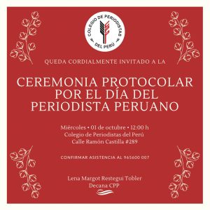 La decana del Colegio de Periodistas de Loreto, Lina Margot Reátegui Tobler, anunció que este 1 de octubre se realizará una ceremonia especial por el Día del Periodista Peruano, en la que se reconocerá la trayectoria de 32 comunicadores. Entre ellos figuran 29 miembros del colegio y tres profesionales que no pertenecen a la orden, pero que han destacado en el ejercicio de la profesión.