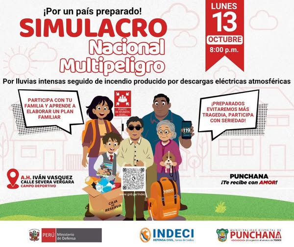 La Municipalidad Distrital de Punchana liderado por su alcalde Olmex Escalante, a través de la Unidad de Gestión de Riesgo de Desastres – Defensa Civil, invita a toda la población a participar activamente en el SIMULACRO NACIONAL MULTIPELIGRO POR LLUVIAS INTENSAS SEGUIDO DE INCENDIO PRODUCIDO POR DESCARGAS ELÉCTRICAS ATMOSFÉRICAS, que se desarrollará el: