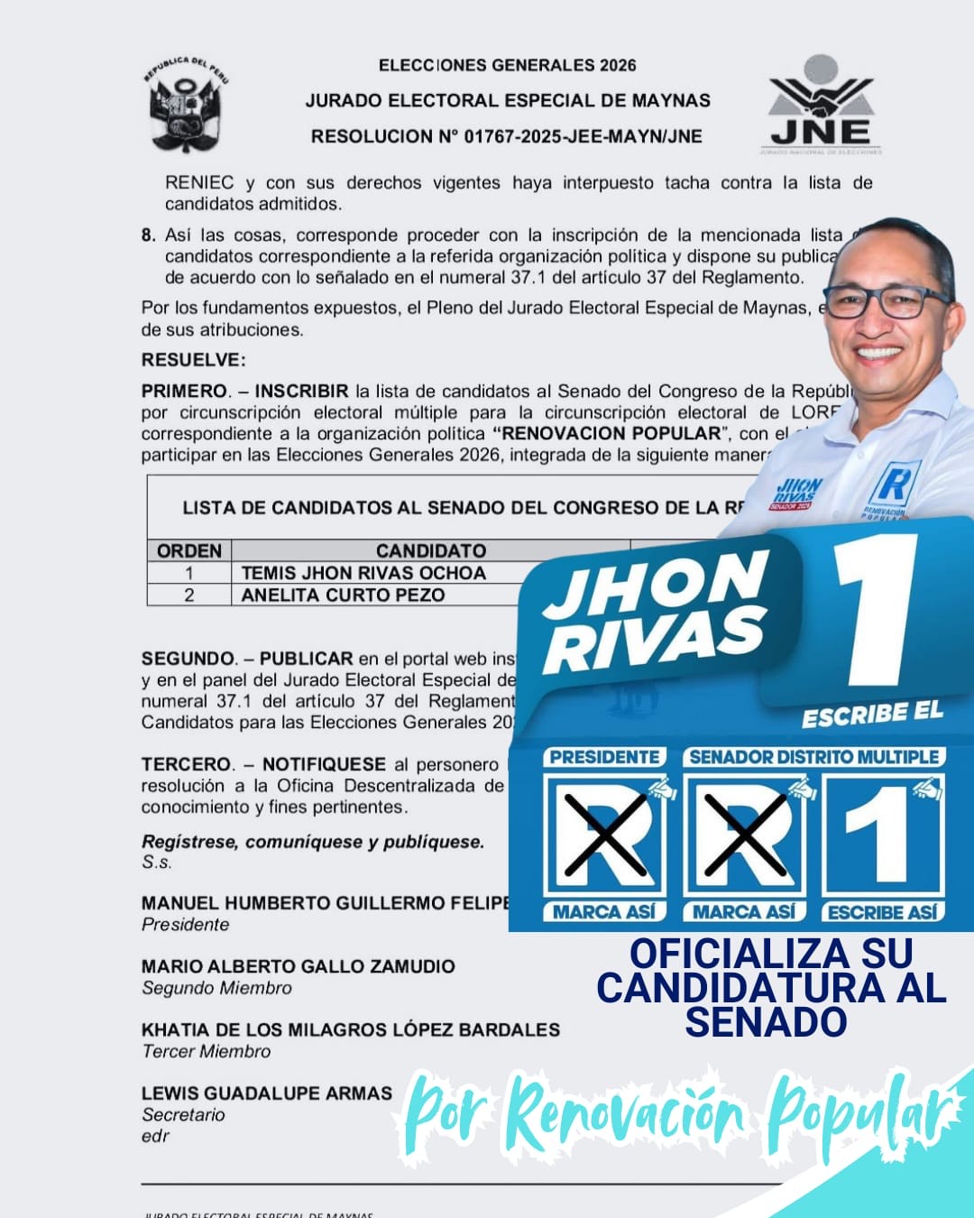Todo esfuerzo altruista bien planificado encomendado a Dios y en beneficio de la población tiene su sana recompensa, y con alegría, humildad y responsabilidad he recibido la Resolución N° 01767-2025-JEE-MAYN/JNE emitida por el Jurado Electoral Especial de Maynas del Jurado Nacional de Elecciones del Perú, en donde resuelve mi inscripción oficial representando a la región Loreto como candidato en el distrito electoral múltiple al Senado del Congreso de la República, en la organización política Renovación Popular con el número 1, para las Elecciones Generales del 12 de abril de 2026.