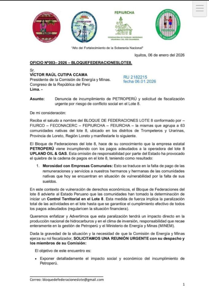 El Bloque de Federaciones del Lote 8 denunció ante la Comisión de Energía y Minas del Congreso el incumplimiento de pagos de Petroperú a la operadora Upland Oil & Gas, situación que ha generado una cadena de morosidad que afecta directamente a empresas comunales y a las familias de 63 comunidades nativas ubicadas en los distritos de Trompeteros y Urarinas, en la región Loreto. La falta de recursos ha colocado a numerosos trabajadores en condición de vulnerabilidad por la interrupción de remuneraciones y servicios básicos.