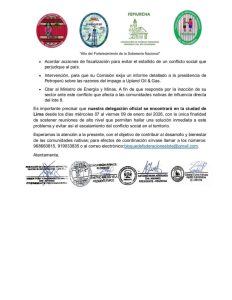 Ante este escenario, las federaciones informaron que las comunidades han decidido iniciar un control territorial en el Lote 8, lo que implicaría la paralización total de las operaciones hasta que se regularicen los pagos adeudados. Asimismo, advirtieron que esta medida tendría un impacto directo en la producción nacional de hidrocarburos y en el clima de inversión, responsabilidad que atribuyen a la gestión de Petroperú y al Ministerio de Energía y Minas, por lo que solicitaron una reunión urgente con el Congreso para evitar la escalada de un conflicto social.