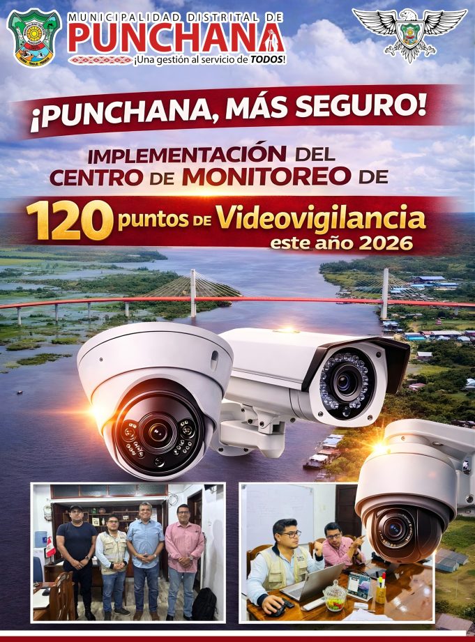 Con el firme compromiso de seguir construyendo un distrito más seguro para todos, la Municipalidad Distrital de Punchana, liderada por el alcalde Olmex Escalante Chota, anuncia la próxima ejecución del proyecto de implementación del Centro de Monitoreo de Videovigilancia, el cual contará con más de 120 puntos de cámaras instaladas en zonas estratégicas de todo el distrito.