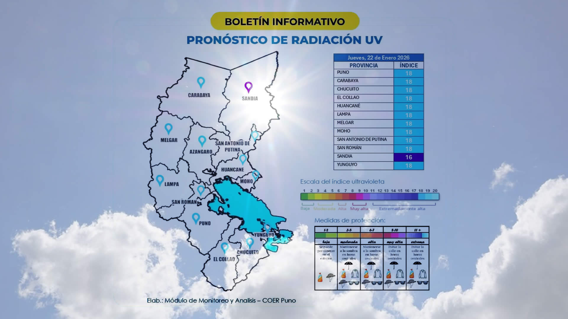 El Servicio Nacional de Meteorología e Hidrología proyecta índice de radiación ultravioleta de 18 puntos para once provincias de Puno este jueves 22 de enero de 2026, mientras Sandia registra nivel 16 dentro de categoría extremadamente alta, según boletín informativo del Centro de Operaciones de Emergencia Regional COER Puno que alerta a la población sobre riesgos inmediatos para la salud.