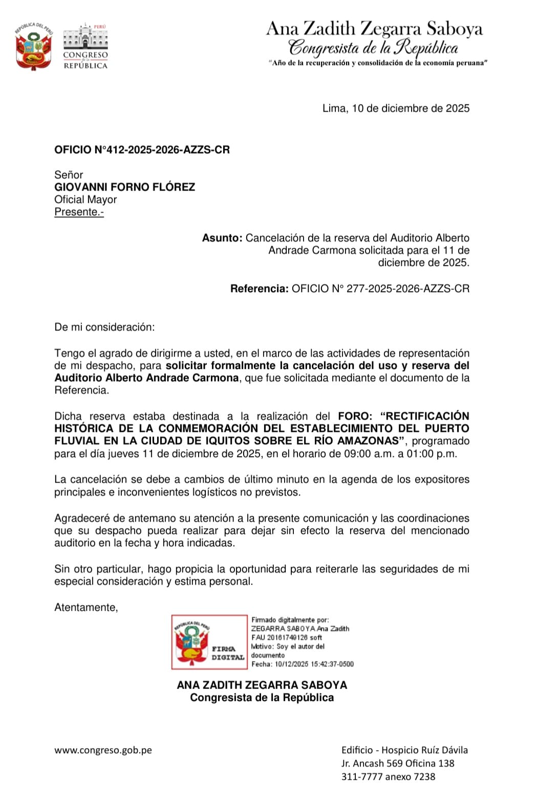 La congresista Ana Zegarra Saboya solicitó formalmente la cancelación de la reserva del auditorio Alberto Andrade Carmona, donde este jueves 11 de diciembre iba a realizarse el foro “Rectificación histórica de la conmemoración del establecimiento del puerto fluvial en la ciudad de Iquitos sobre el río Amazonas”. Según indicó en el oficio remitido al Oficial Mayor del Congreso, la decisión responde a cambios de último minuto en la agenda de los expositores principales y a inconvenientes logísticos no previstos que a último momento le informaron desde la Municipalidad Provincial de Mayna.